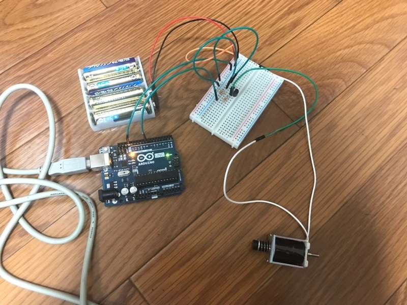 ちなみに、箱をくり抜いてそこにソレノイドを差し込んだだけ。箱の下に3DSを置いています。ソレノイドを長い時間HIGHにしていると熱くなってくるので注意です。