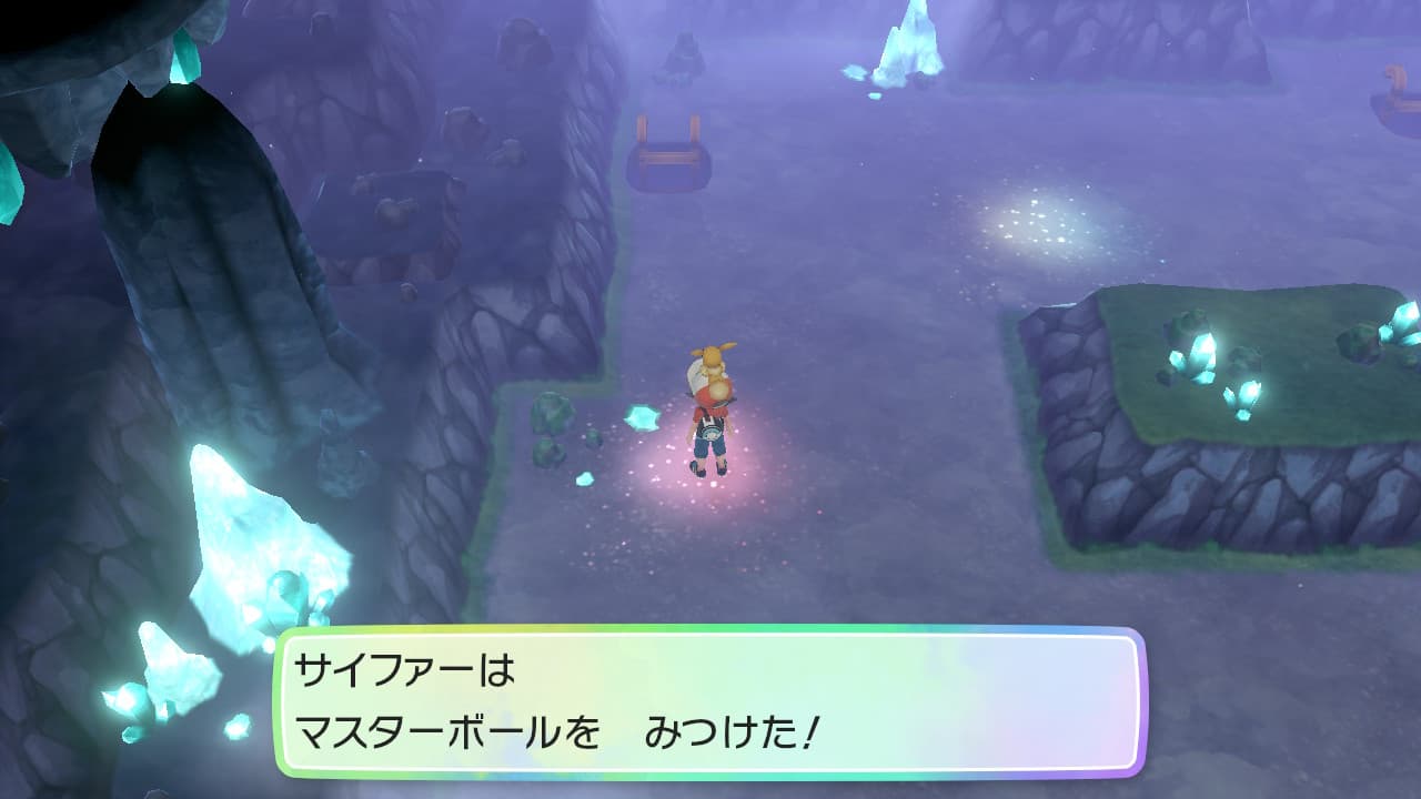 ピカブイの殿堂入り後に入ることができる「ハナダのどうくつ」には隠しアイテムが落ちているエリアがあります。そこには木の実やボール等が落ちている*1のですが、後者については1/301の確率でマスターボールがドロップします。最近のゲームの色違い出現率よりも低めな確率です。